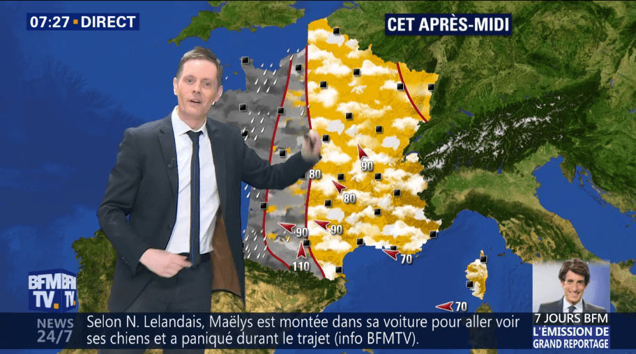 Sur le plateau de BFM Week-end première avec mon collègue Damien Gourlet à la fin de l'année 2021. Mon métier de présentateur météo représente 10% de mon temps. Il me permet de communiquer ma passion, mais je suis surtout météorologiste, climatologue et créateur de la société meteo-villes.