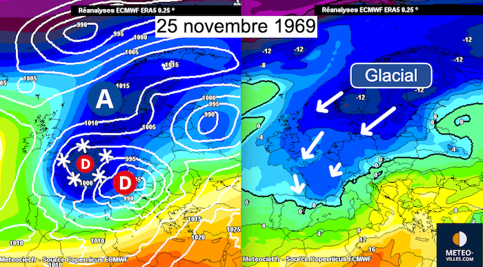 Après les chutes de neige conséquentes et étendues des 25 et 26 novembre 1969, les températures nocturnes descendent à –10 °C à Saint-Étienne, –8 à -10°C dans les zones peu urbanisées de l'Ile-de-France et surtout –29,6 °C à Mouthe, valeur qui constitue encore aujourd’hui le record absolu national pour un mois de novembre ! La commune du Jura confirme alors sa réputation de « petite Sibérie » française, liée à sa topographie de cuvette favorisant l'emprisonnement d’air froid.