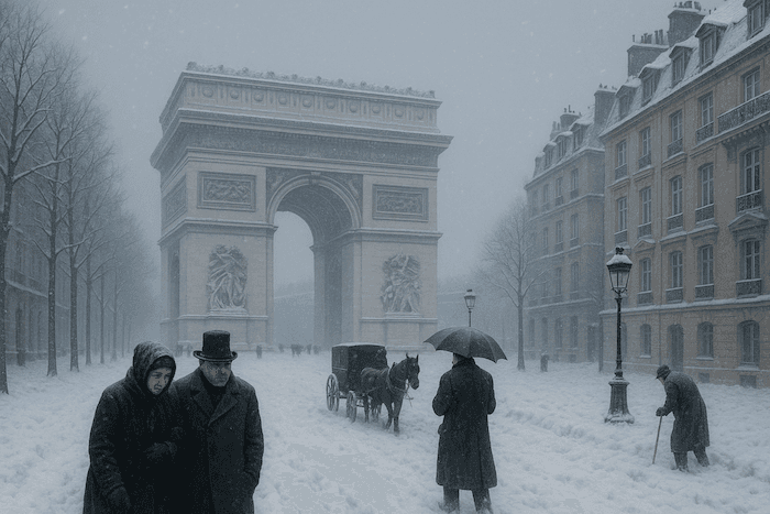 Paris sous environ 40 cm de neige en décembre 1879 - illustration par intelligence artificielle