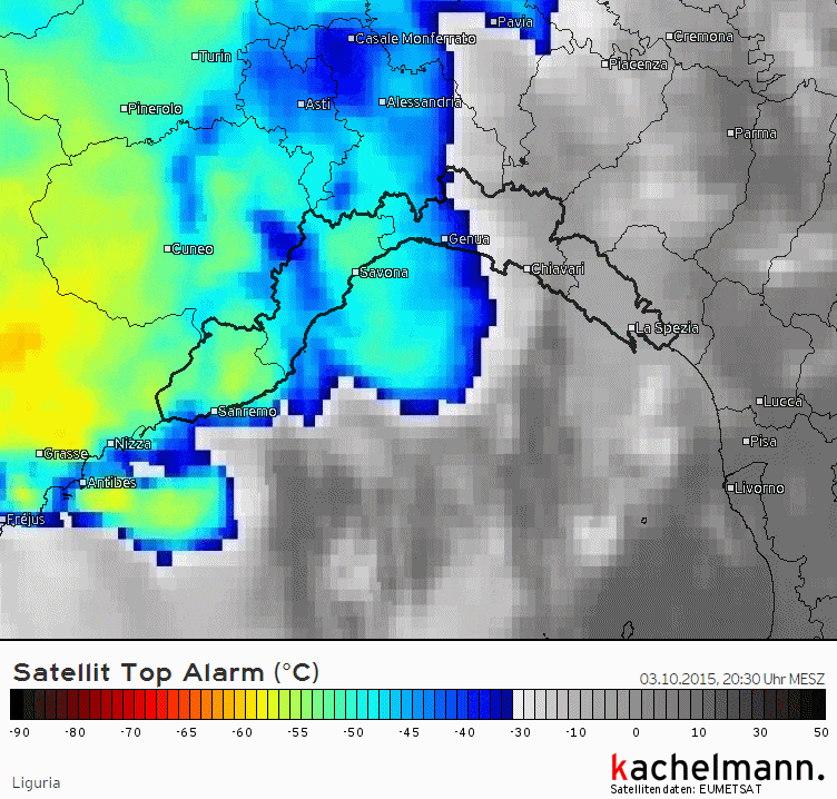 Animation satellite sur le sud-est de la France entre 20h et 22h le 3 octobre 2015 - Via keraunos.org