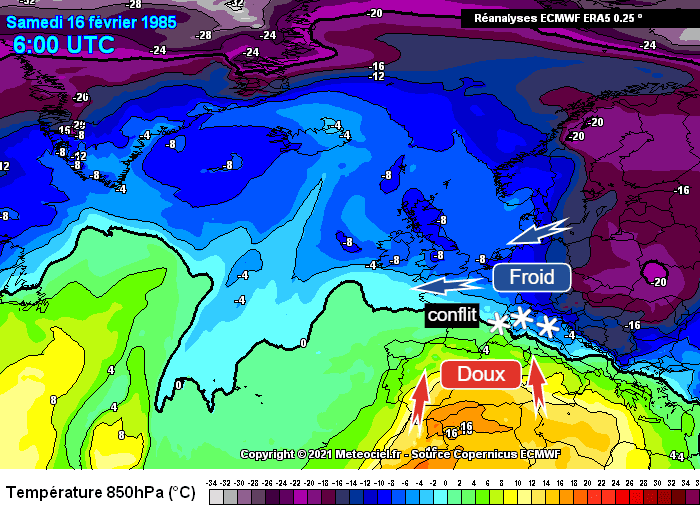 Masse d'air à 850 hPa (vers 1500m) le samedi 16 février 1985 - réanalyse via meteociel.fr