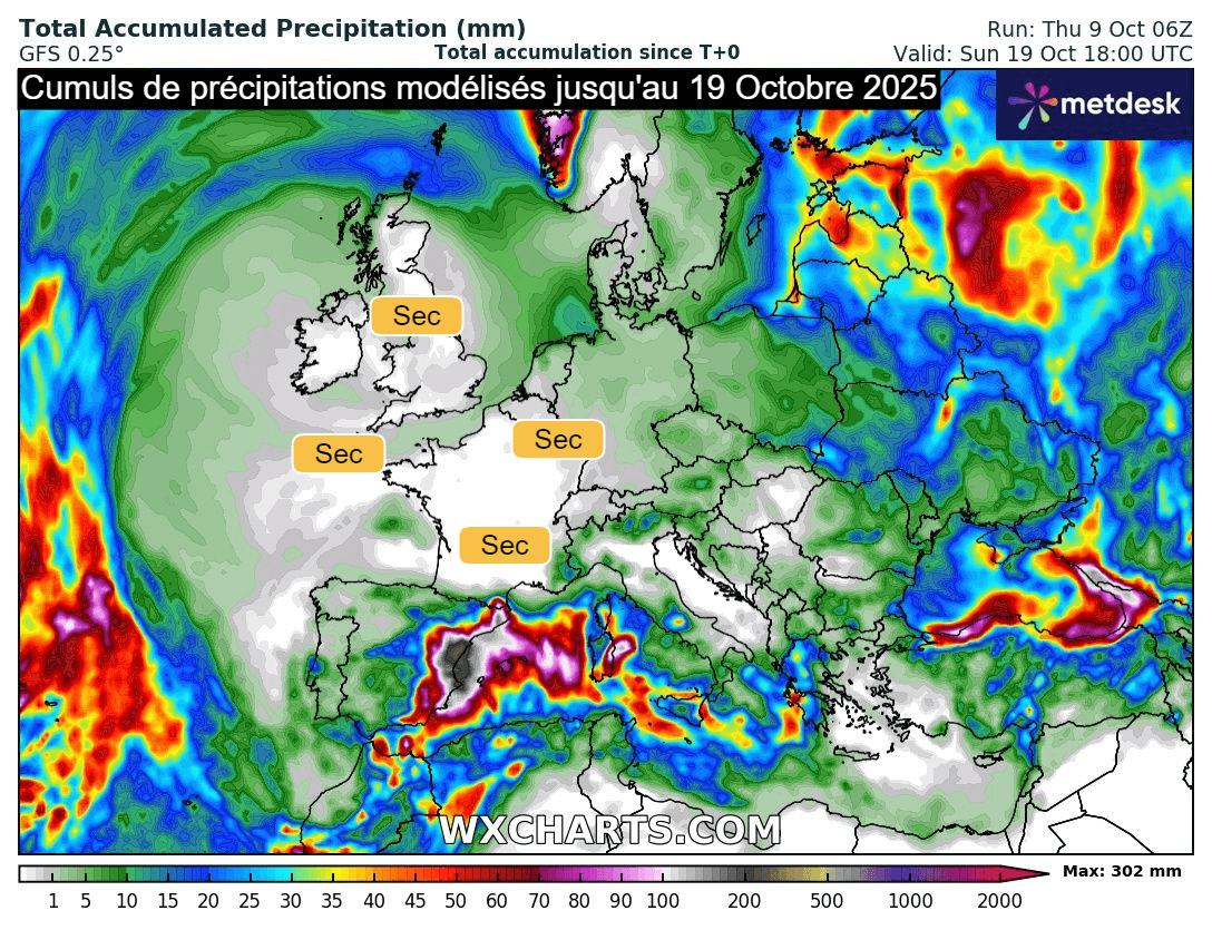 Cumuls de précipitations modélisés jusqu'au 19 octobre 2025 - wxcharts.com