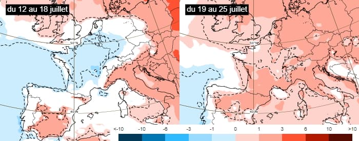Les modélisations à plusieurs semaines semblent s'accorder sur ce scénario d'amélioration après la mi-juillet. Si la semaine du 12 au 18 juillet 2021 serait dominée par des anomalies fraiches en France, ce sont des anomalies chaudes qui prendraient le relais durant la semaine du 19 au 25 juillet 2021, et ce sur l'ensemble du pays. Nous retrouverions alors des sensations nettement plus estivales.