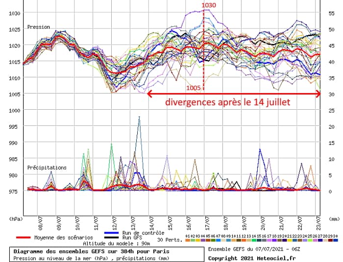 Diagramme des ensembles (pressions et précipitations) pour Paris du 7 au 23 juillet 2021 - via meteociel.fr