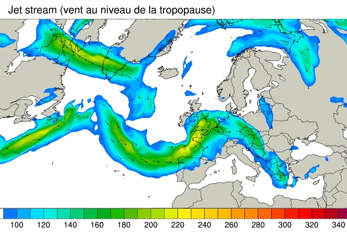 Pour appuyer le caractère automnal de la configuration actuelle, on observe un courant de jet linéaire sur l'Atlantique, circulant jusqu'en France avec des vitesses parfois supérieures à 200 km/h vers 9000 mètres d'altitude. Cette situation favorise la circulation des perturbations sur notre pays et s'observe bien plus souvent en automne qu'en été. C'est d'ailleurs ce courant jet qui a contribué à renforcer la dépression ayant donné une tempête sur la Bretagne en début de semaine. >>>