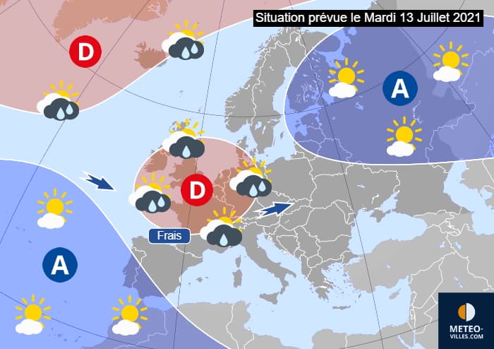 Situation à échelle continentale prévue le mardi 13 juillet 2021 - Météo Villes