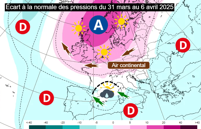 Ensuite, les dernières projections envisagent le positionnement des hautes pressions durant la semaine du lundi 31 mars au dimanche 6 avril 2025.