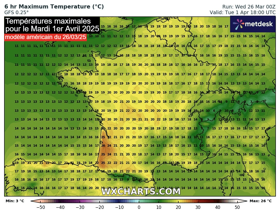 Températures maximales du mardi 1er avril 2025 projetées par le modèle américain - wxcharts.com