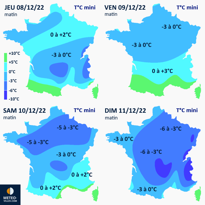 Prévisions des températures minimales du jeudi 8 au dimanche 11 décembre 2022 - Météo Villes