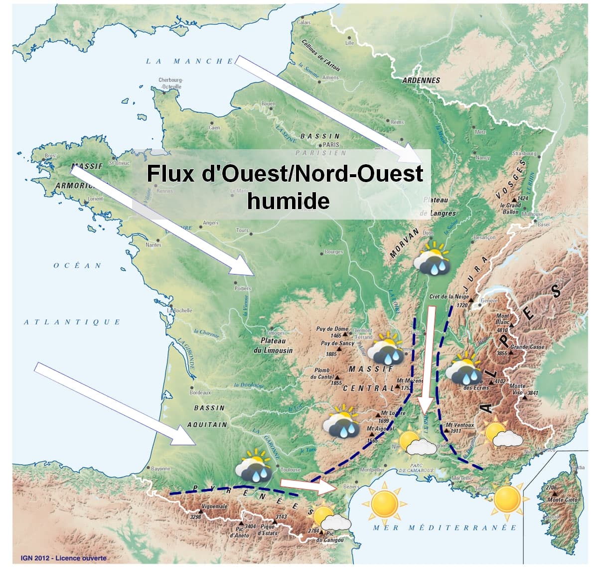 Si le reste du pays est plus facilement influencé par la circulation océanique (flux d’Ouest/Nord-Ouest perturbé), la méditerranée est « fermée » et protégée dans ce type de situation. Les reliefs bloquent en effet l’humidité contre les versants les plus à l’Ouest/Nord-Ouest et la masse d’air est asséchée en s’écoulant vers le Sud-Est du pays.