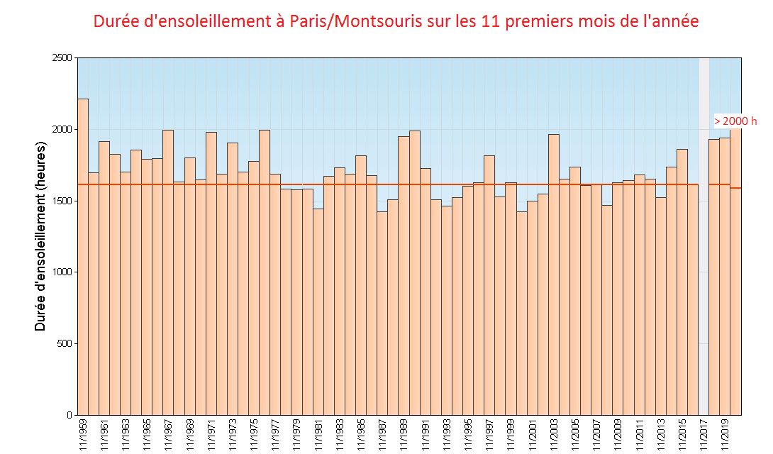 Ensoleillement durant les 11 premiers mois de l'année à Montsouris depuis 1959 - via Météo-France