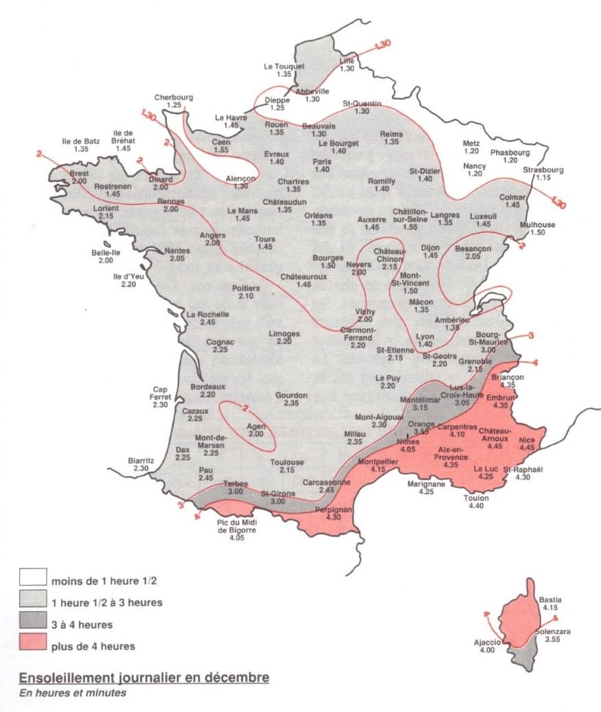 Ensoleillement moyen en Décembre (normales 1951-1980) - Livre "Météo de la France" par Jacques Kessler