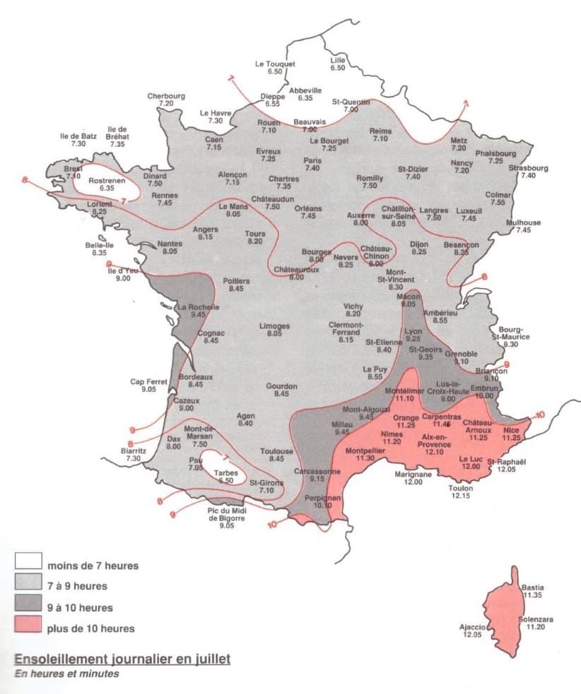 Ensoleillement moyen en Juillet (normales 1951-1980) - Livre "Météo de la France" par Jacques Kessler