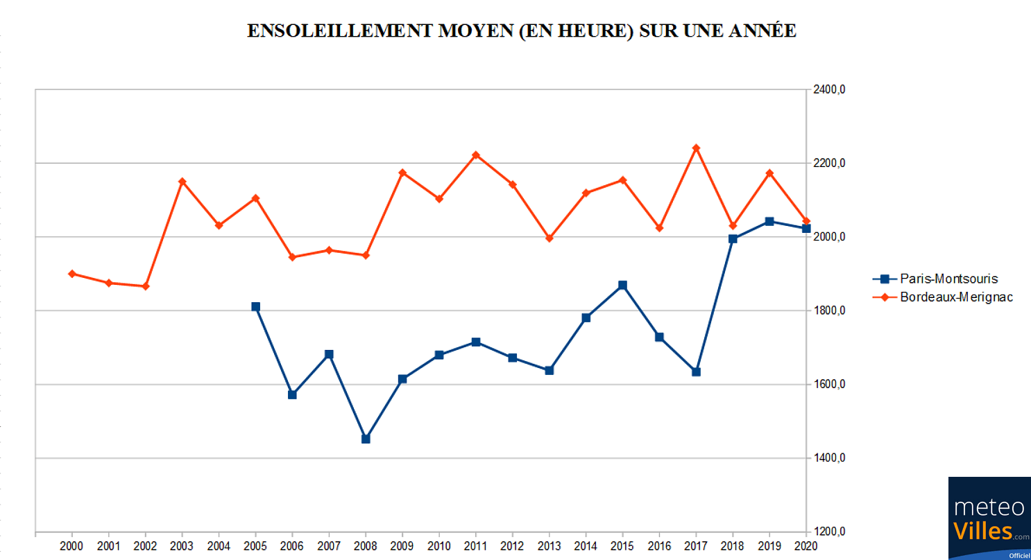 Graphique comparant l'évolution des durées d'ensoleillement annuelles à Paris-Montsouris et Bordeaux depuis le début des années 2000 - Météo-Villes