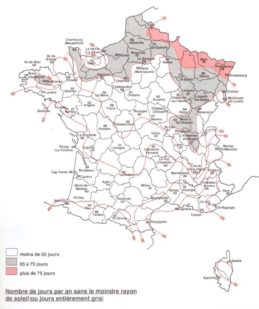 Ainsi, c’est sur le Nord et notamment le Nord-Est du pays que le nombre de jours sans soleil est le plus important sur une année avec un maximum de 78 jours à Strasbourg sur la période 1951-1980. Ceci s’explique par la situation géographique de la région.