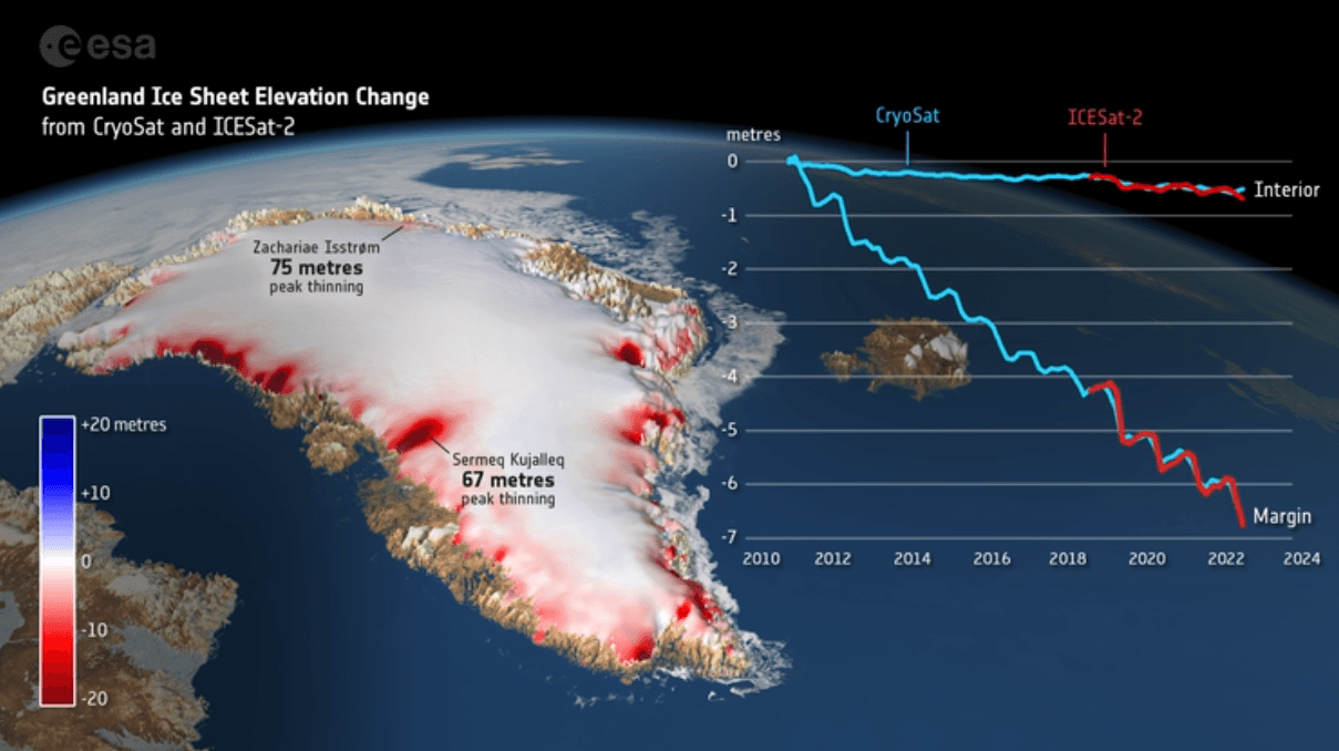 Évolution de la hauteur de la calotte glaciaire du Groenland de 2010 à 2024 - ESA