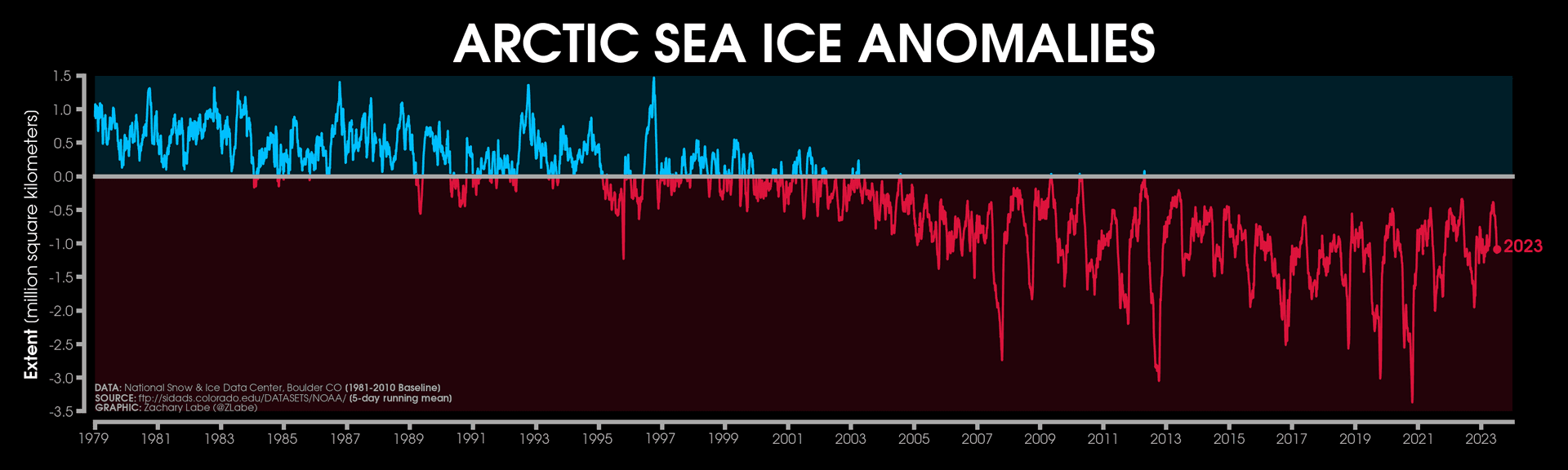 Si contrairement à l'Antarctique les records ne sont actuellement pas battus, le constat est alarmant : l'étendue de ces glaces sur l'océan Arctique est perpétuellement sous ces moyennes depuis 20 ans ! Une fonte continue depuis plusieurs décennies s'étant accélérée au début des années 2000, et avec des anomalies de plus en plus extrêmes constatées depuis une dizaine d'années !
