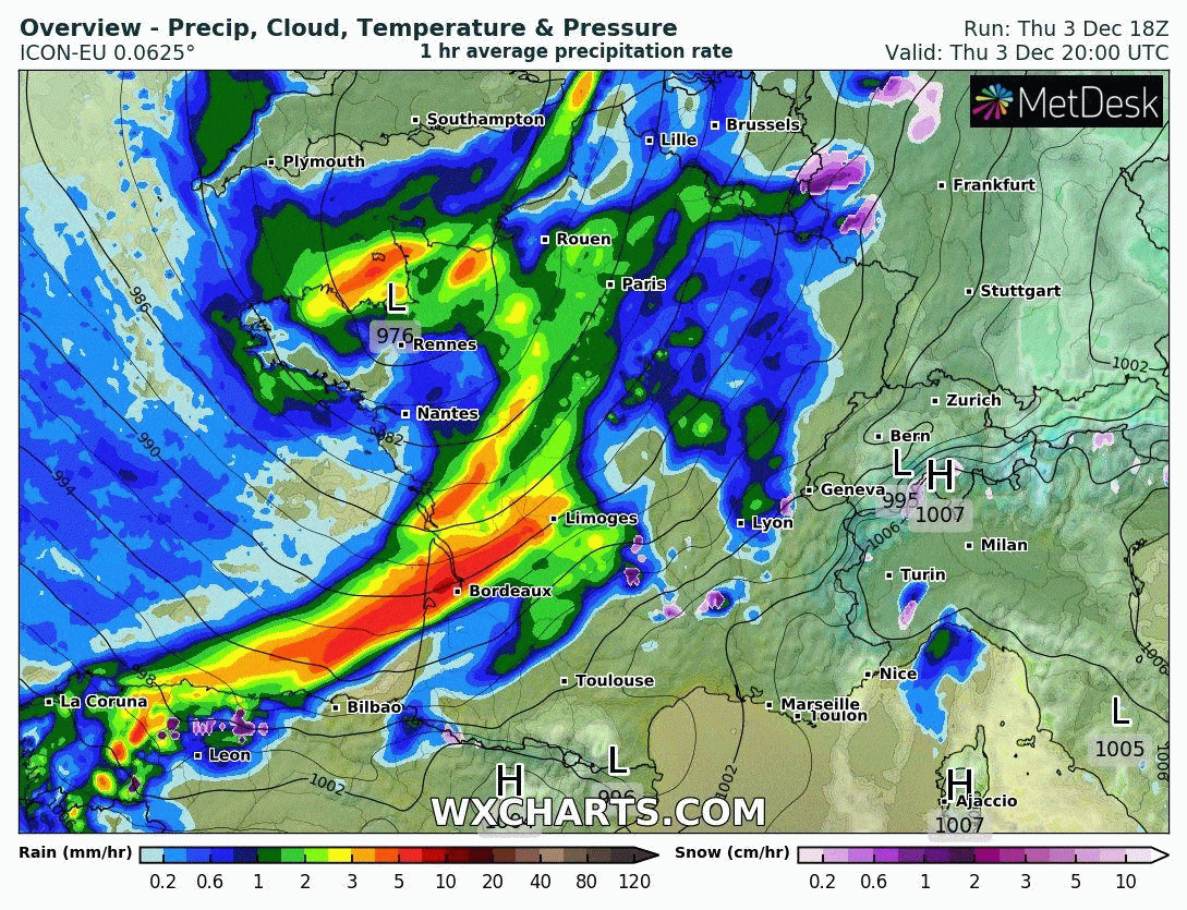 Animation des précipitations du jeudi 3 décembre 2020 au soir jusqu'au samedi 5 au matin - via wxcharts.com