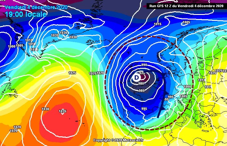 C'est une dépression très creuse qui est à l'origine du temps perturbé des dernières heures. Ce vendredi 4 décembre 2020, celle-ci était centrée sur l'Angleterre avec un coeur à moins de 975 hPa. Ce système dépressionnaire s'étale sur l'ensemble de l'Europe de l'Ouest avec des basses pressions jusqu'au nord du Maghreb.