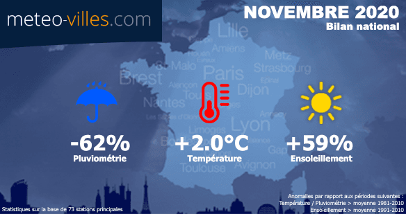 Comme à chaque début de mois, nous vous proposons un bilan climatologique du mois écoulé. Place donc au bilan cartographié du mois de NOVEMBRE 2020 en termes de température, pluviométrie et ensoleillement sur un panel de 73 stations*.