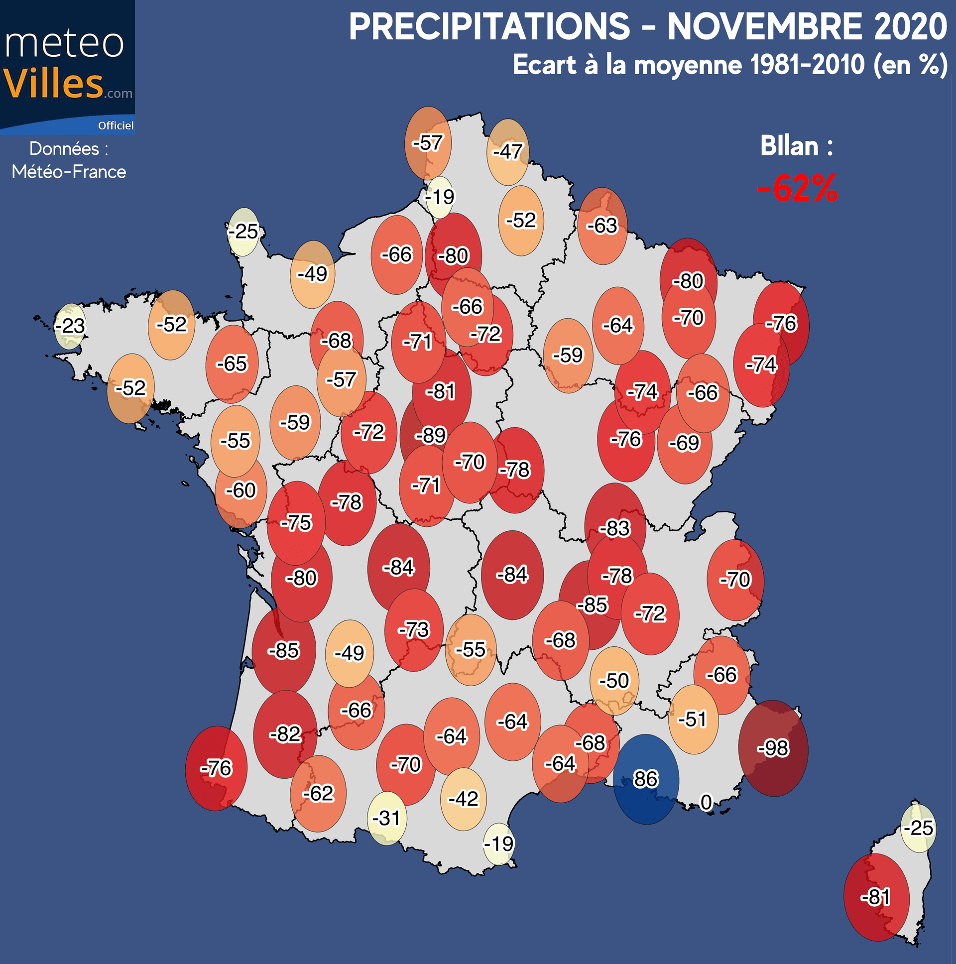 Ailleurs, une véritable Bérézina avec de nombreuses régions sous les 20mm seulement. Par endroit, le cumul est même anecdotique : seulement 2mm à Nice, 6mm à Clermont-Ferrand, 7mm à Romorantin, 9mm à Saint-Etienne ! Paris ne s’en sort pas beaucoup mieux avec 17 maigres millimètres récoltés durant ce mois de novembre.