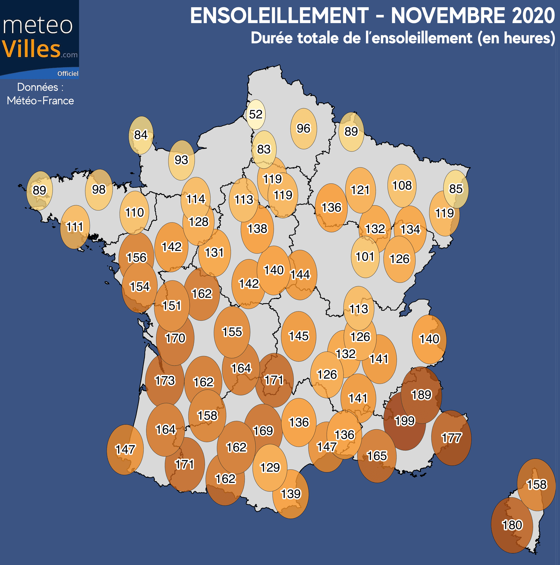Avec de telles anomalies, de nombreuses villes ont donc battu leur record d’ensoleillement pour un mois de novembre : Bordeaux (173h), Auch (172h), Pau (170h), Poitiers (162h), Nantes (156h), Clermont-Ferrand (145h), Nevers (144h), Luxeuil (134h), Langres (132h), Le Mans (128h), Lyon (126h), Colmar (119h), Paris (118h) ou encore Charleville-Mezières (89h).