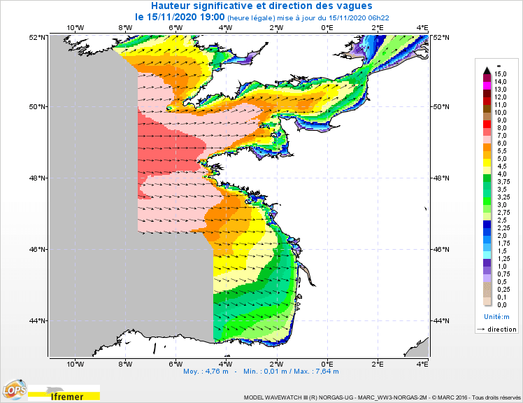 Hauteur maximale des vagues - après-midi du dimanche 15 novembre 2020 – Ifremer