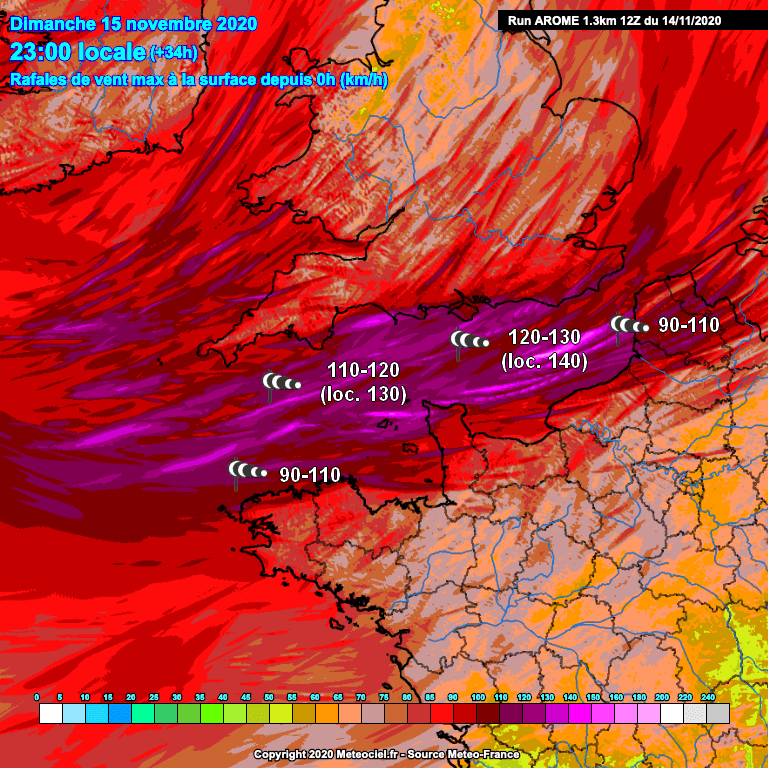 Rafales maximales prévues - dimanche 15 novembre 2020 - Modèle Arome via Météociel