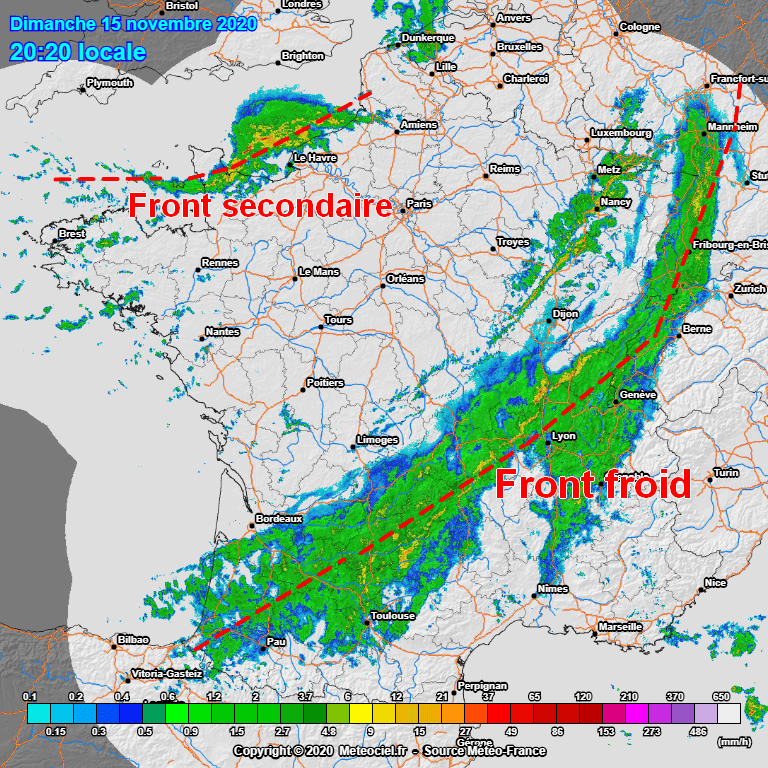 Image radar de la France en fin de journée du Dimanche 15 Novembre matérialisant les deux fronts circulant sur le pays - Via météociel.fr