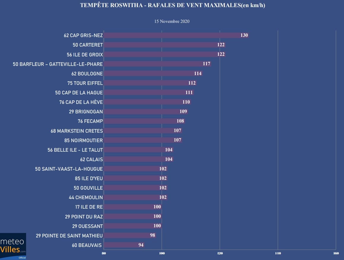 Graphique des rafales maximales relevées en France lors du passage de la tempête le 15 Novembre - Météo-Villes