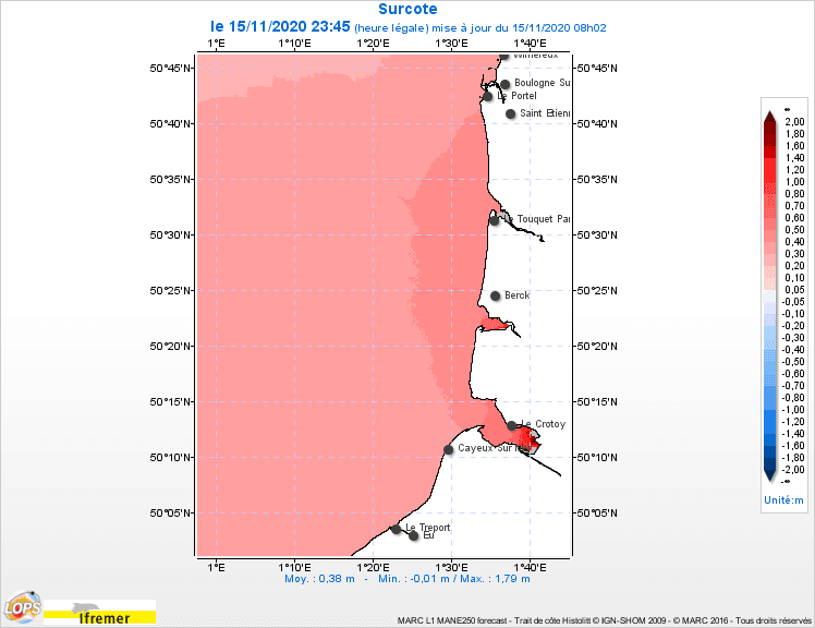 Surcote à la pleine mer en Côte d'Opale - début de nuit du dimanche 15 au lundi 16 novembre 2020 - Ifremer