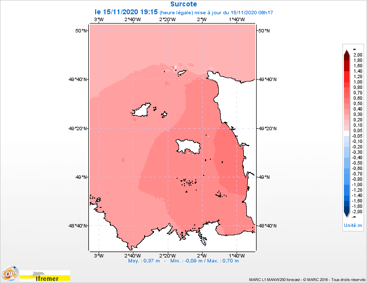 Surcote à la pleine mer en Bretagne et Manche - fin d'après-midi du dimanche 15 novembre 2020 – Ifremer