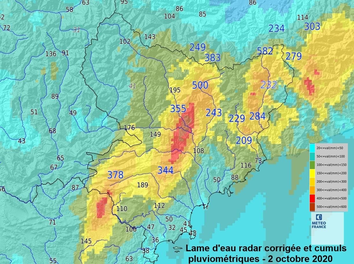 Ces cumuls furent toutefois sensiblement inférieurs aux prévisions de la veille où des pointes à près de 300mm étaient envisagées sur les reliefs des Alpes-Maritimes, une bonne nouvelle car les secteurs ayant reçu les quantités de pluie les plus importantes sont particulièrement similaires à ceux qui avaient été durement touchés par la tempête Alex il y a 3 ans.