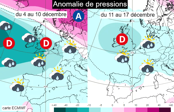 Anomalies de pression du 4 au 10 décembre et du 11 au 17 décembre 2023 - cartes ECMWF