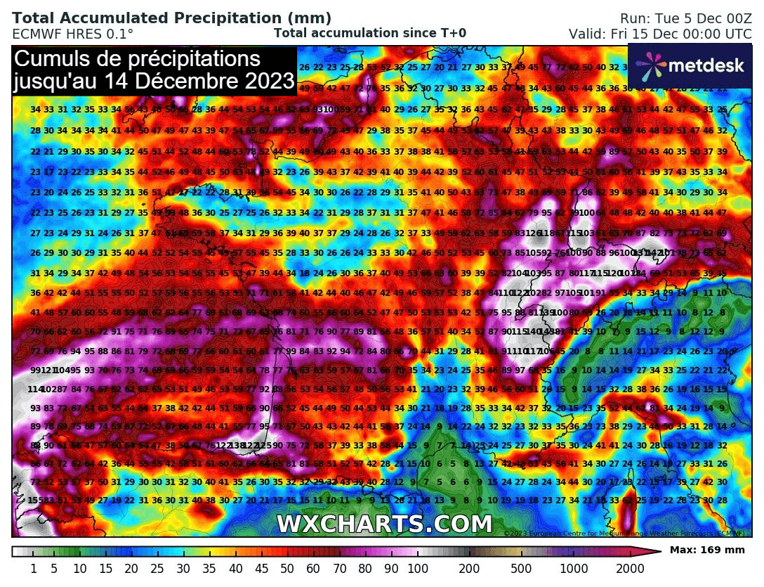 Cumuls de précipitations modélisés jusqu'au 14 décembre 2023 - carte wxcharts.com