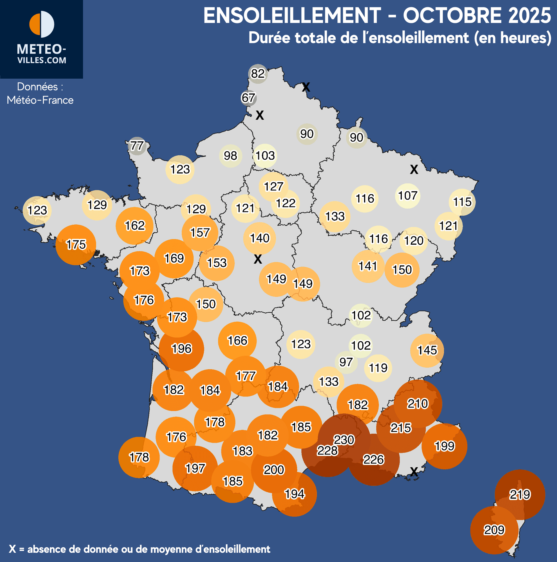 Néanmoins, ce nombre est très largement porté par un excellent ensoleillement sur tout l'Ouest du pays ainsi que sur le Languedoc avec de +20 à +40% d'excédent en moyenne (+34% à Nîmes, +39% à Cognac, +41% à Nantes, +46% à Lorient). D'autres régions n'ont pourtant pas eu cette chance avec une grisaille bien plus présente : c'était par exemple le cas dans le val de Saône et en région Lyonnaise avec des nuages bas fréquents et tenaces (-15% à Mâcon, -23% à Lyon, -28% à Saint-Etienne), ou encore au nord de la Seine (-9% à Rouen, -22% à St-Quentin, -39% au Touquet) ainsi que sur le Cotentin (-22% à Cherbourg).