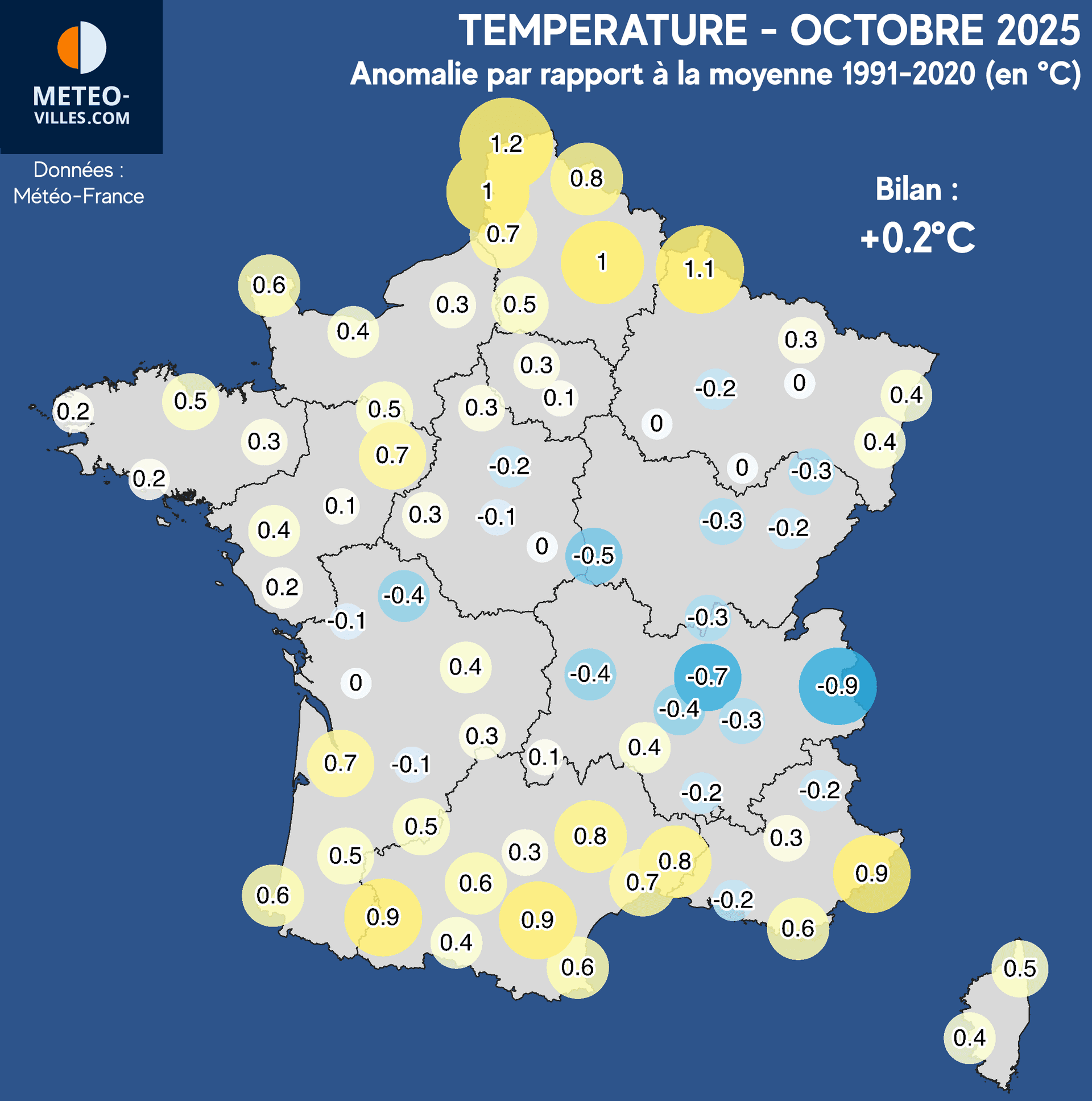Comme à chaque début de mois, nous vous proposons un nouveau bilan climatologique. Place désormais au bilan cartographié d'OCTOBRE 2025 en termes de température, pluviométrie et ensoleillement sur un panel de 73 stations*. Les anomalies présentées sont calculées à partir des moyennes climatiques de la période de référence 1991-2020 sur l'ensemble des stations du panel.