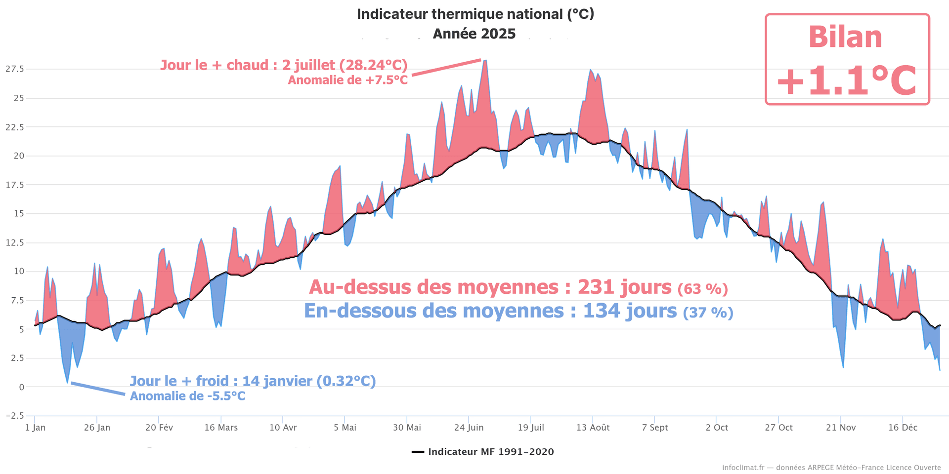 Une nouvelle fois bien au-delà des moyennes ! Avec un indicateur thermique national de 14.03°C pour 2025, nous venons de vivre en France la 4e année la plus chaude depuis le début des mesures météorologiques, à quasi-égalité avec la 3e place détenue par l'année 2020 (14.07°C). Nous nous situons exactement à +1.06°C au-dessus de la moyenne de référence de la période 1991-2020 (qui s'établit à 12.97°C).