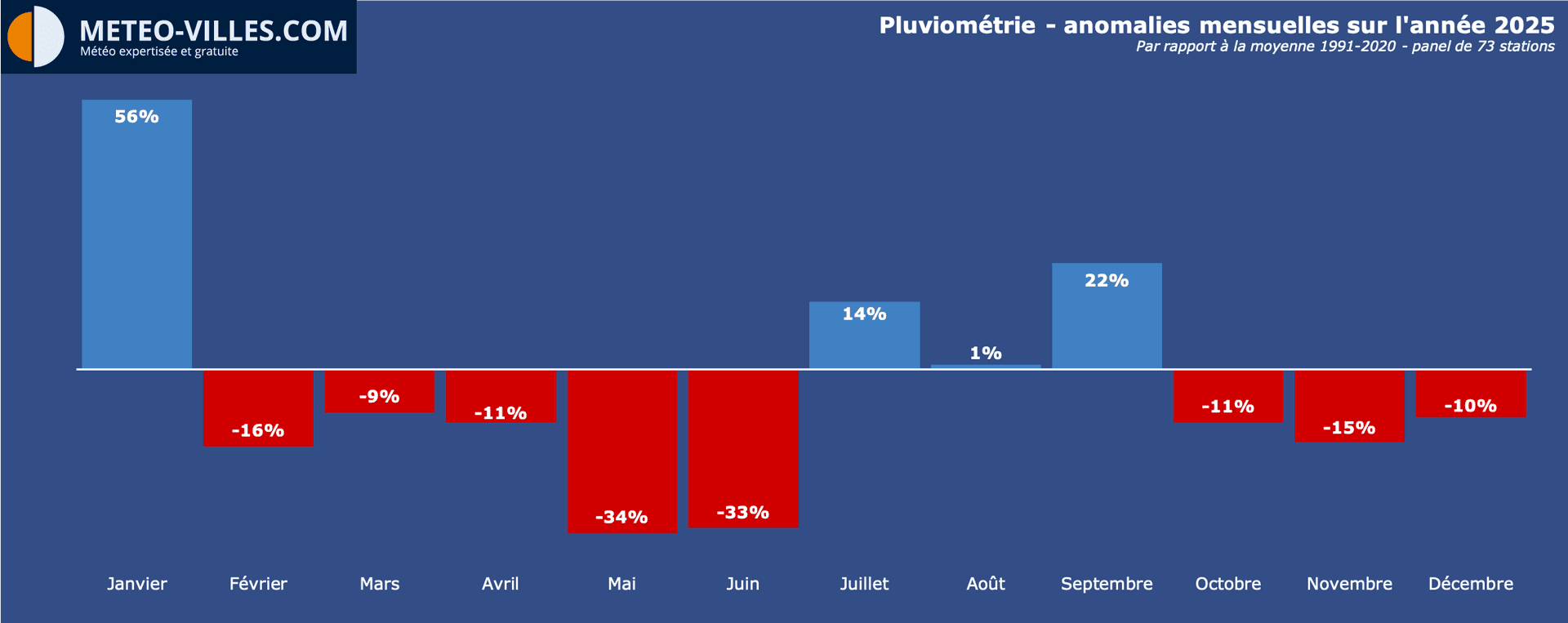 Pourtant, cette année 2025 avait débuté comme s'était terminé 2024, sous des pluies abondantes et des inondations parfois remarquables en janvier (+56%) notamment en Bretagne (avec la succession des dépressions Eowyn, Herminia puis Ivo). Mais cette tendance s'est inversée à partir du mois de février avec des conditions plus sèches.