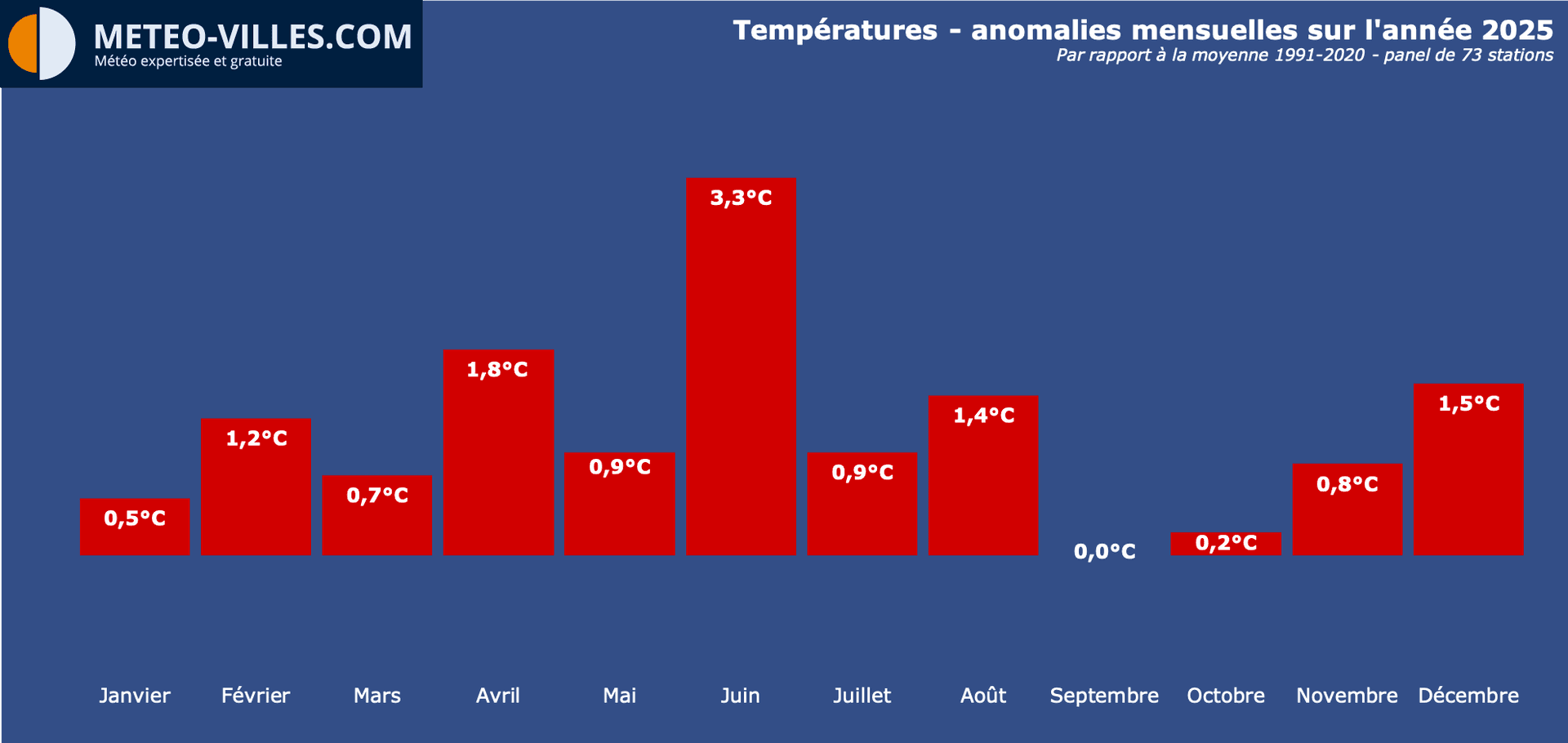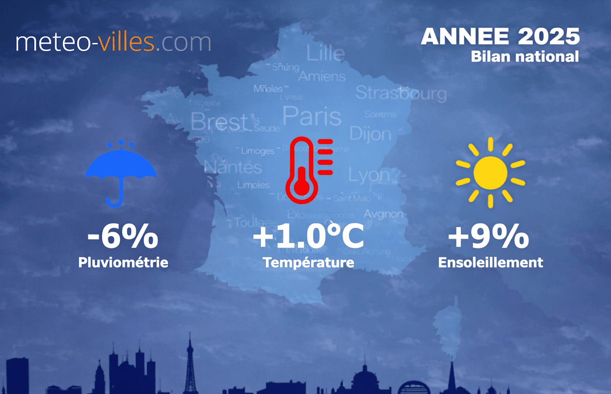 Toute l'équipe de Météo-Villes vous souhaite une très bonne année 2026 ! Et pour débuter cette nouvelle année, il est l'heure de faire les comptes de l'année écoulée. Place donc au bilan météorologique et climatique complet de cette ANNÉE 2025 en termes de température, pluviométrie et ensoleillement sur un panel de 73 stations, (par rapport à la moyenne climatique de référence 1991-2020)*.