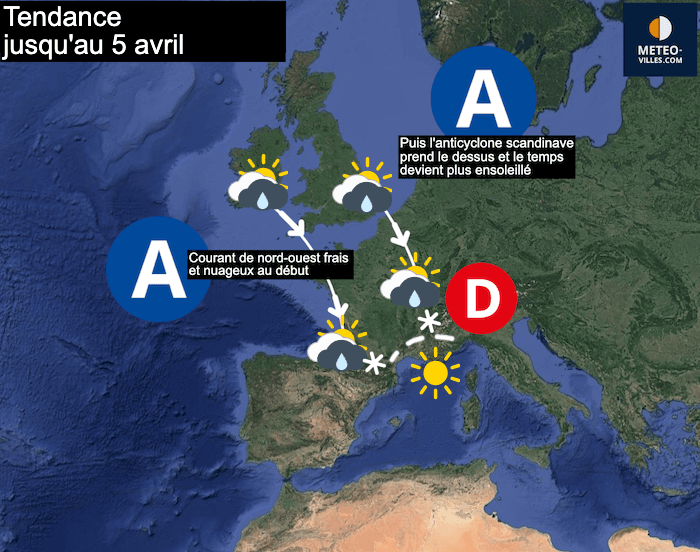 Le courant de nord-ouest domine jusqu'au 5 avril selon la plupart des modèles météo... carte meteo-villes.com