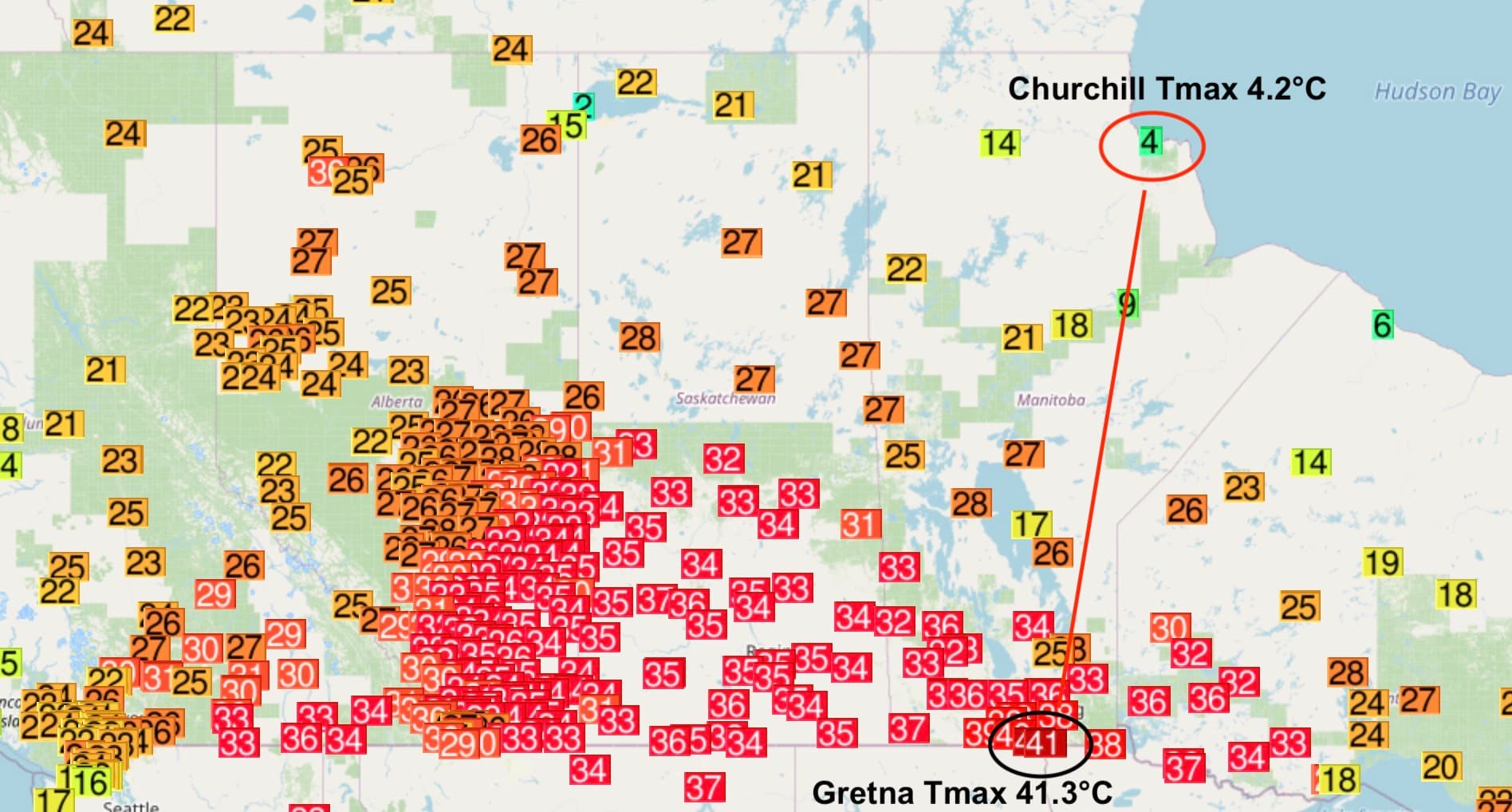 Température record et contrastes entre le Manitoba et l’Hudson Bay le 5 juin dernier – Via twitter @ThierryGooseBC