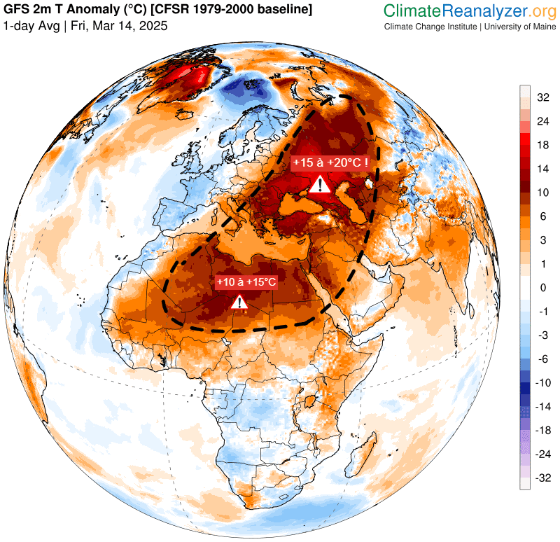 Anomalies de températures ce 14 mars 2025 entre l'Afrique et l'Europe – via ClimateReanalyzer