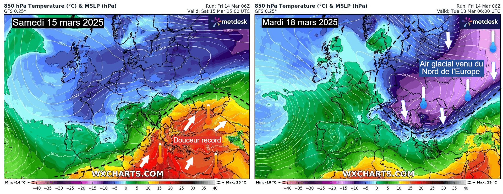 Comparaison des températures à 850 hPa sur l'Europe entre le 15 et le 18 mars 2025 – Modèle GFS via WX CHARTS