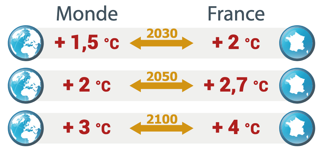 Prévisions de réchauffement en France et dans le Monde en 2030, 2050 et 2100 par rapport à l’ère pré-industrielle d’après la TRACC - Météo-France