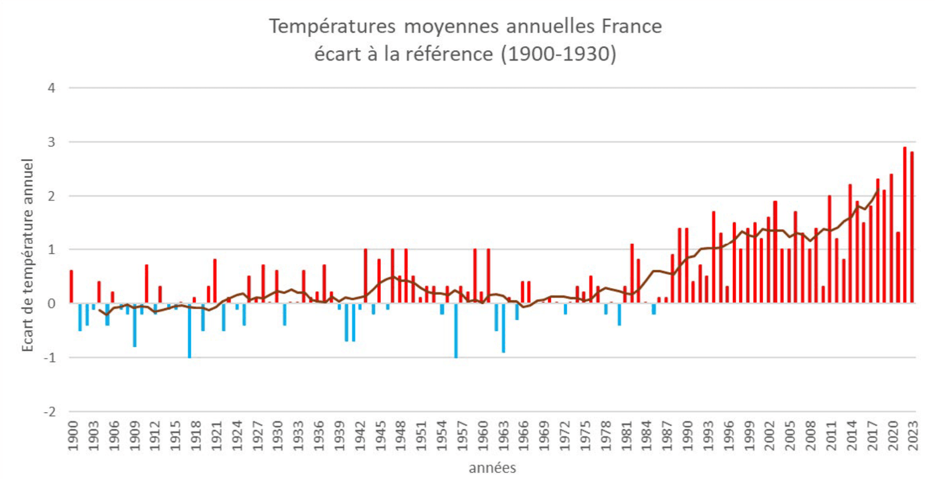Sur la France métropolitaine, des statistiques climatiques fiables sont disponibles depuis 1900. Ainsi, par rapport à la période 1900-1930 (début de la période industrielle), il fait état d’une hausse de la température moyenne annuelle de +1.8°C sur la décennie 2011-2020, et atteignant même +2.1°C pour la période 2014-2023.