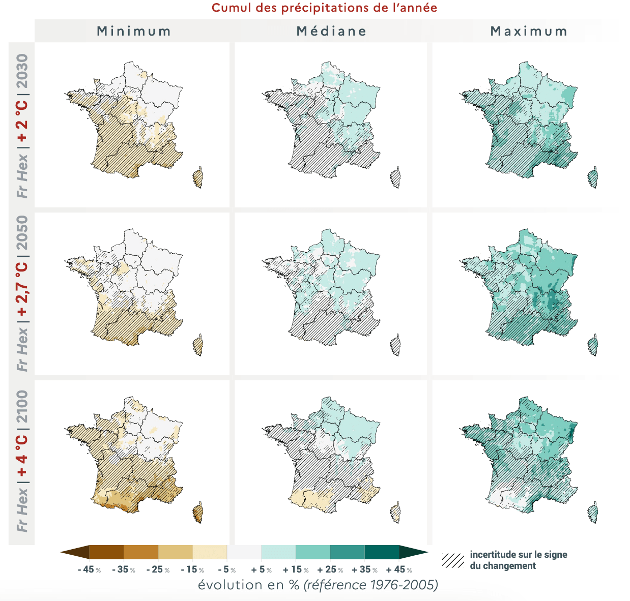 Évolution des précipitations moyennes en France à l’horizon 2030, 2050 et 2100 par rapport à la période 1976-2005 - Météo-France