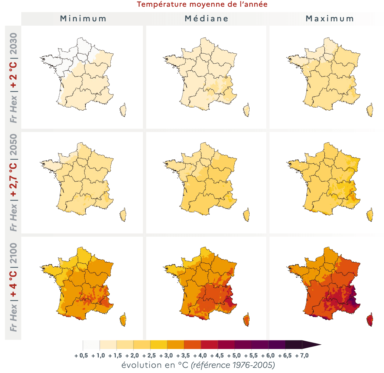Évolution des températures annuelles moyennes en France à l’horizon 2030, 2050 et 2100 par rapport à la période 1976-2005 - Météo-France