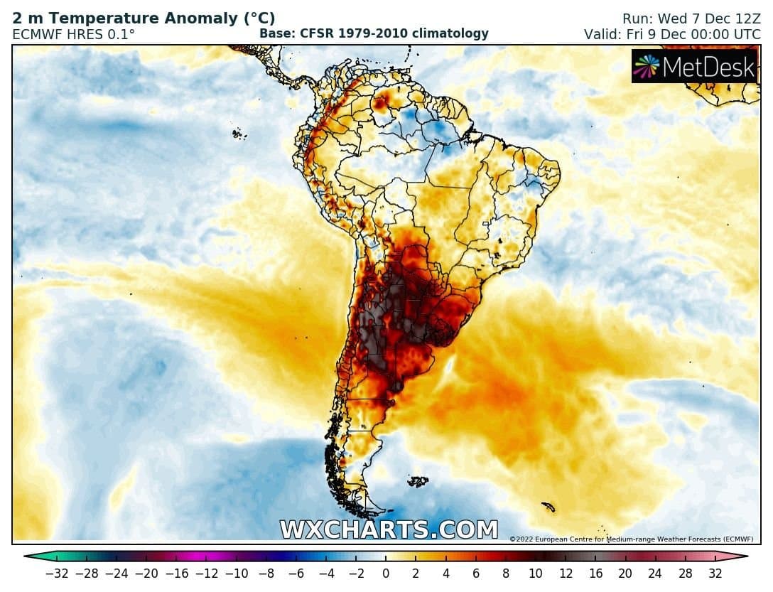 Anomalies de températures sur le Sud de l'Amérique ce vendredi 9 décembre 2022 – Via WX CHARTS