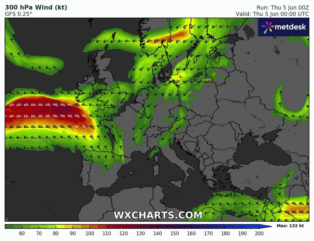 Vitesse du courant jet (vent vers 9000m d'altitude) du jeudi 5 au dimanche 8 juin 2025 - wxcharts.com